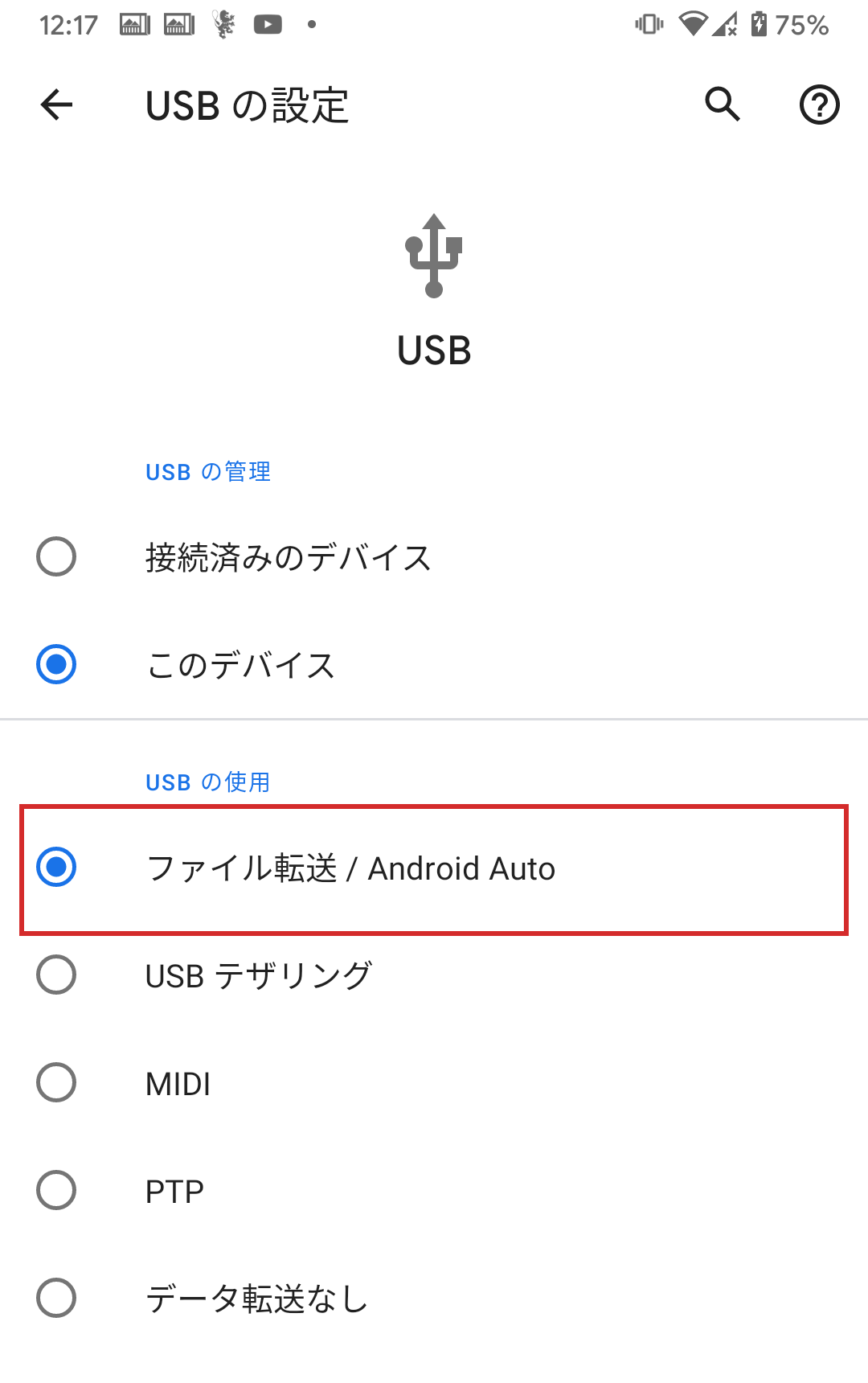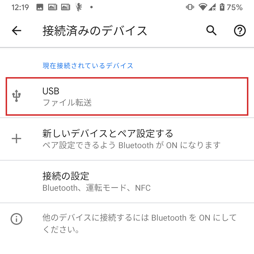 「USB ファイル転送」をタップする。ここも「USB接続設定」などと表記が違う場合があるので同じような項目を探してください。