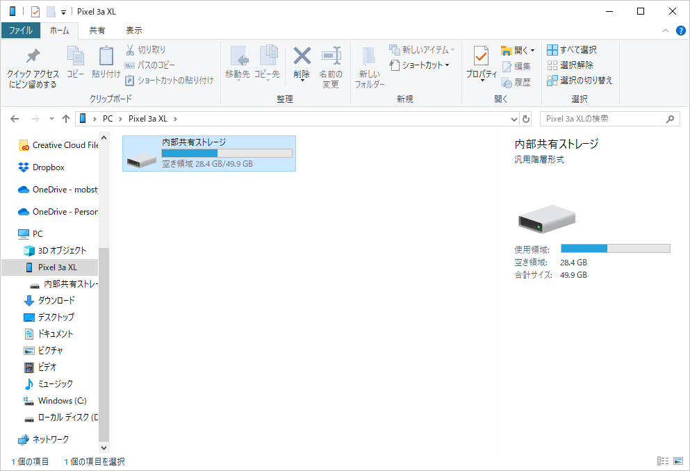 エクスプローラー左側のツリーに「Pixel 3a XL」が表示されているのが確認できます。これで、パソコンからスマートフォンに保存されているデータを操作することが出きます。