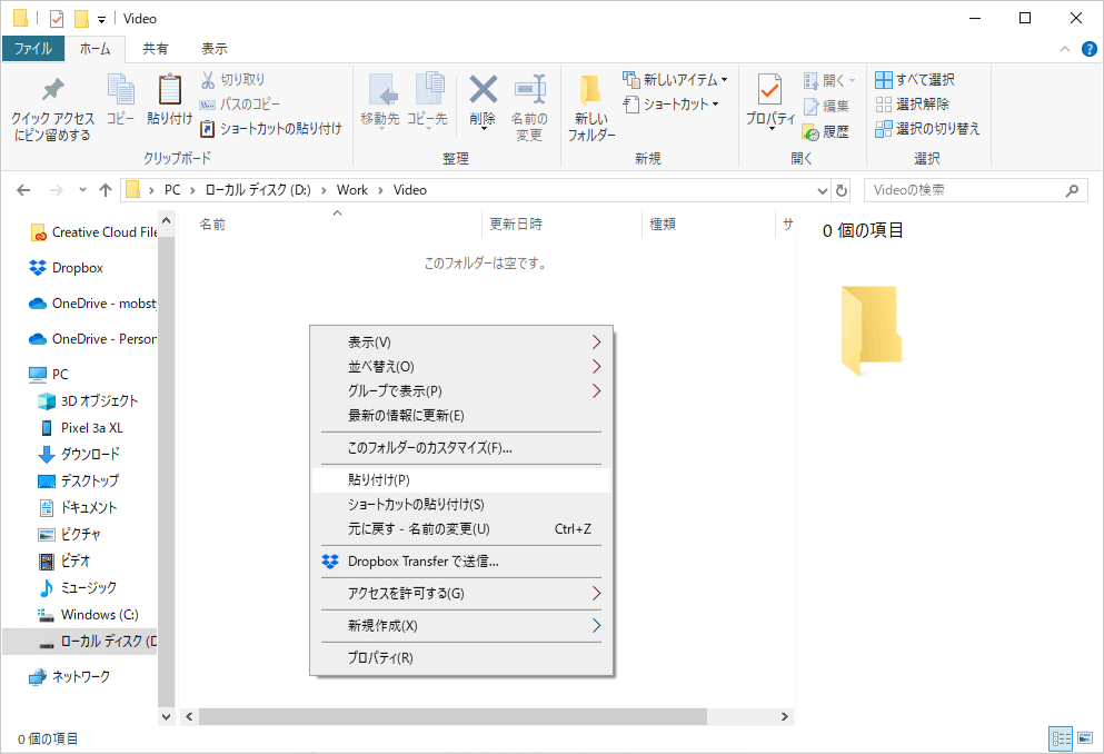 動画データを保存したいフォルダを開いて、開いたフォルダ上で右クリック